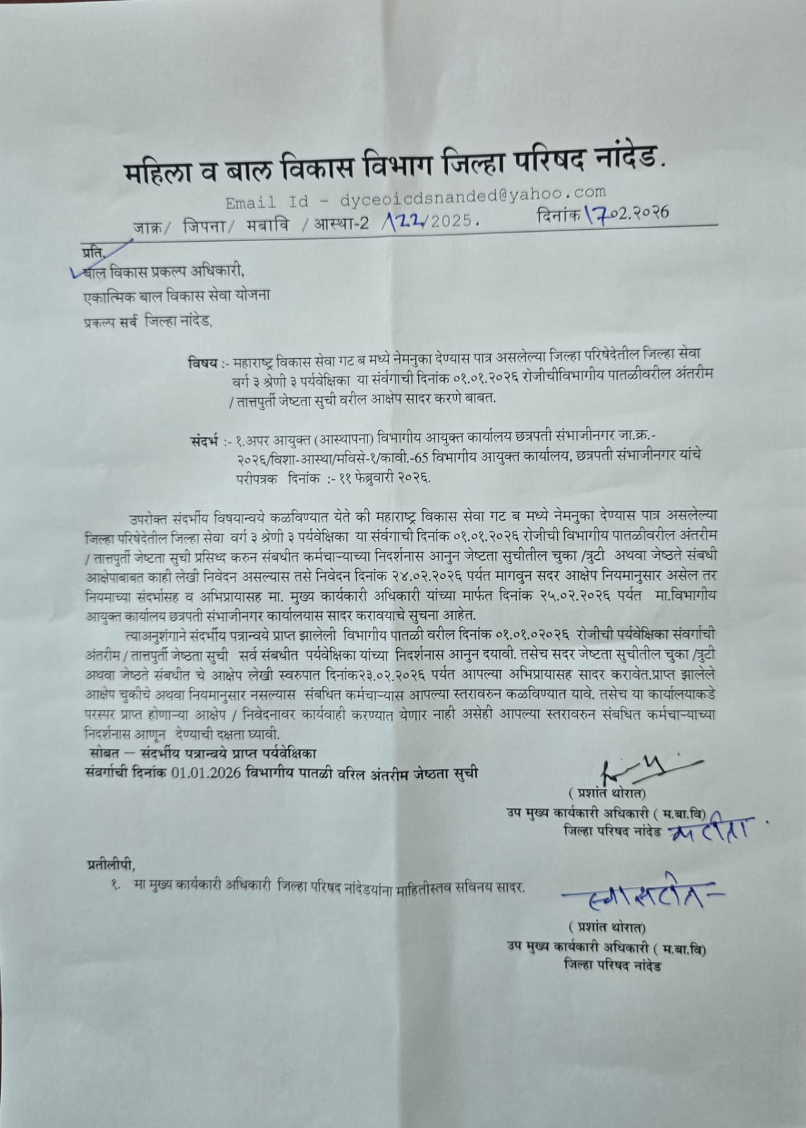 | जिल्हा सेवा वर्गा – 3 पर्यवेक्षिका संवर्गातील दिनांक – 01.01.2026 ची प्राथमि | 14/01/2026 |